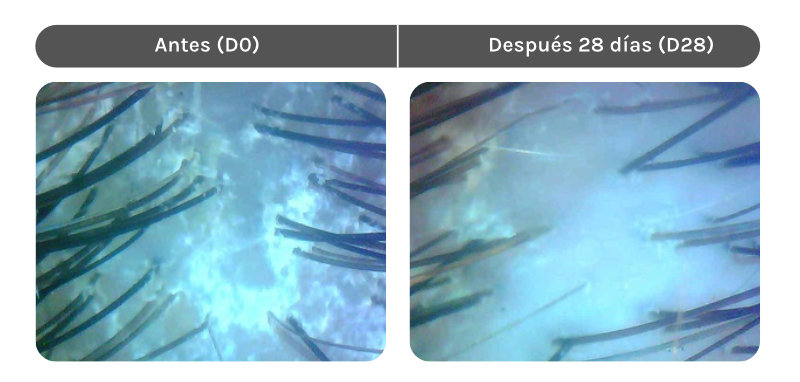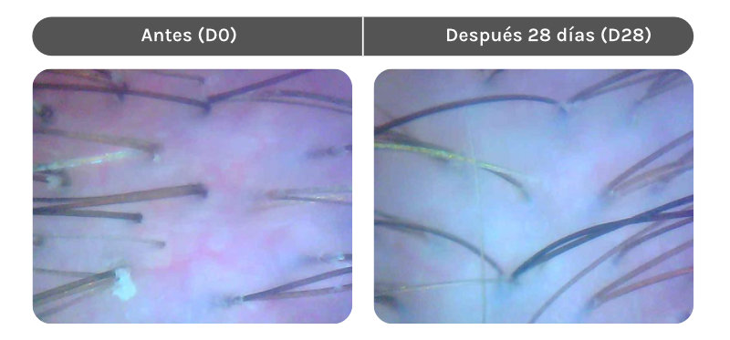 Las imágenes de la queratina del cuero cabelludo en zoom 60 veces antes de la aplicación (D0) y después de 28 días (D28) de uso regular.
